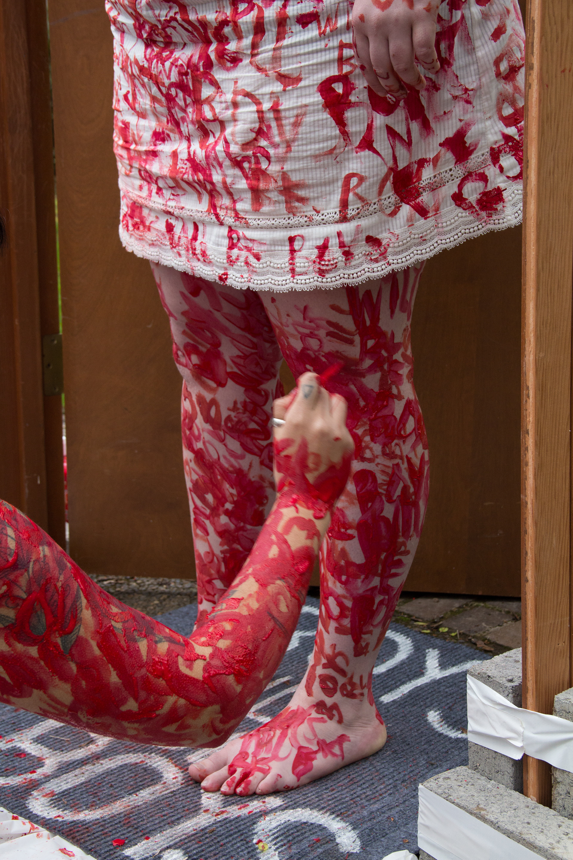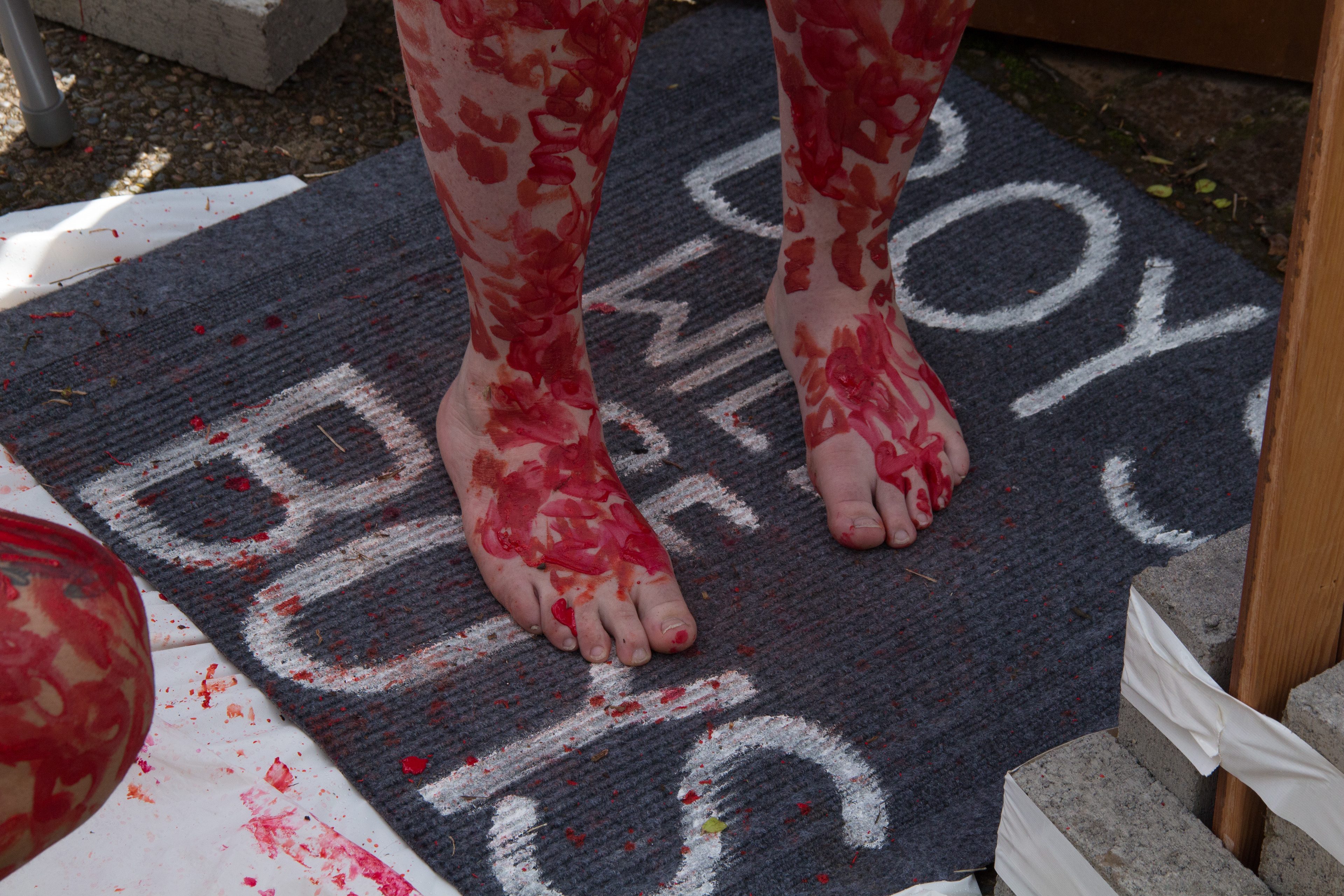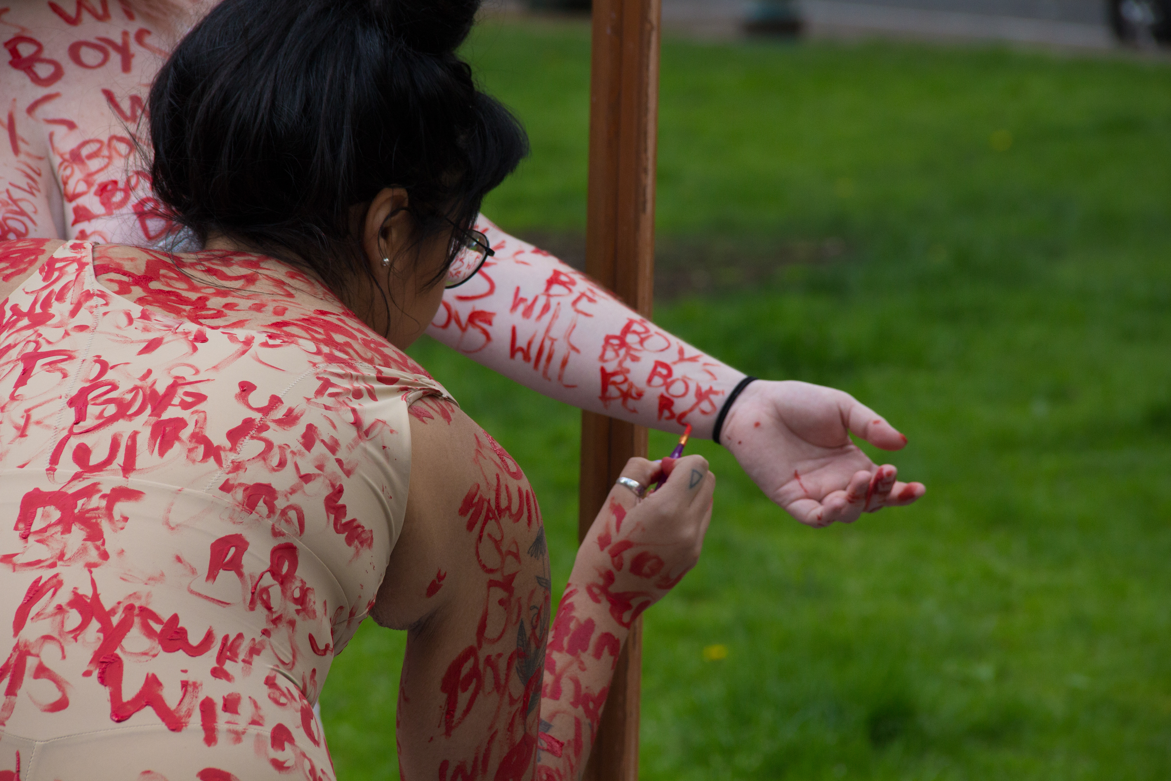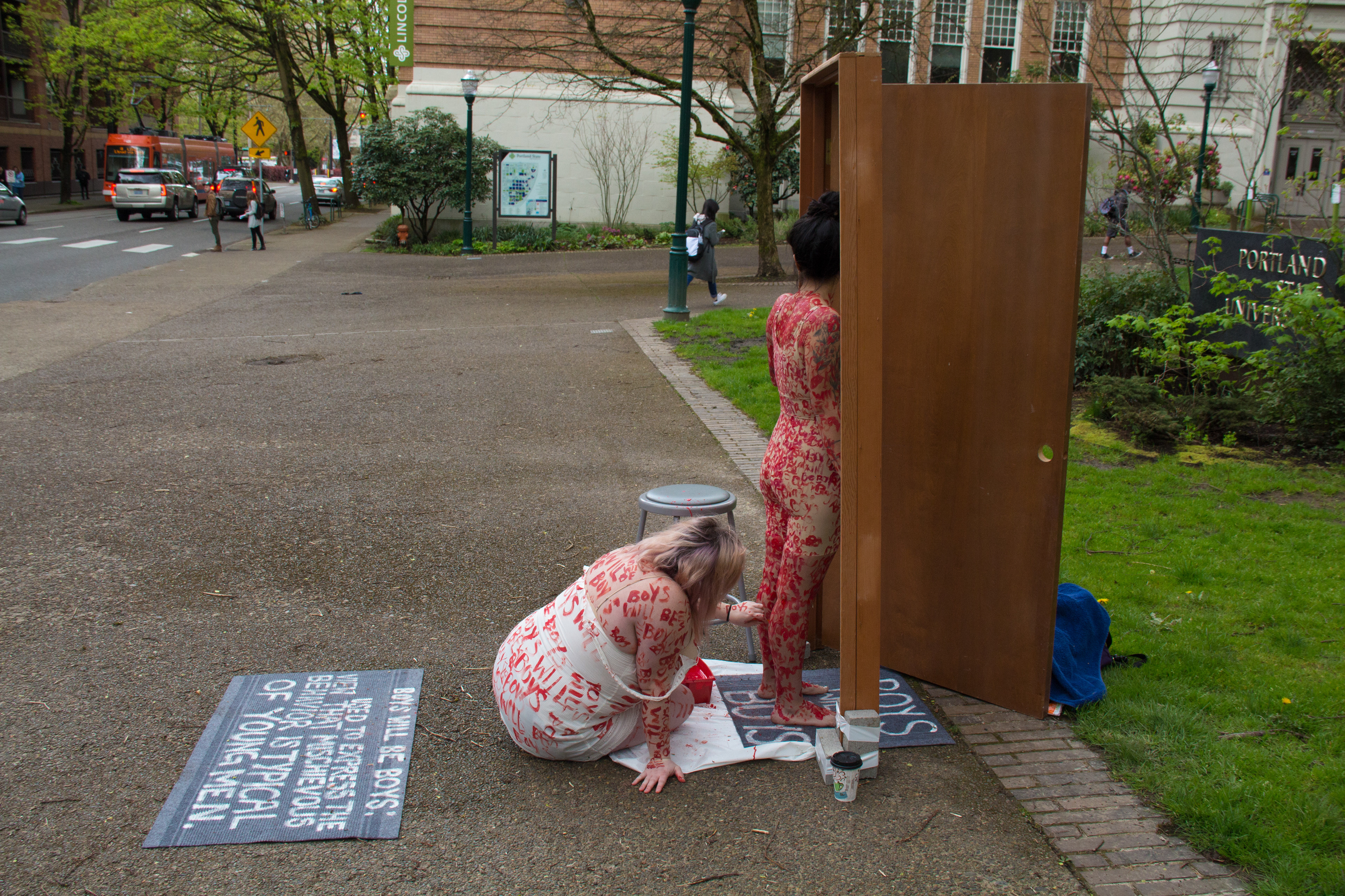 Boys will be boys, 18 April 2017 performance duration 3:00:00 Guerrilla outdoor performance festival, Portland OR. Photographed by: Jaleesa Johnston A large part of rape culture is the refusal and cultural inability to accept that the action of rape is at the hands of a rapist. The phrase "Boys will be boys" has been such a widely used phrase for such a long time; that over time, society and culture has essentially given men a pass and shifted the responsibility of their own action, from their own hands because of the idea that "that's what is expected of them." We have to replace "boys will be boys" with an acceptable and realistic idea: Boys will be what we expect them to be. Women grow up being taught tips, tricks and lessons on how to not be raped, but as a society we never teach potential rapists to not rape. The intention of our piece is to create a dialogue around how harmful it is to not give the responsibility of rape to the rapist. We want to focus on the harsh reality of the matter, as well as the repetitive commonality of the phrase in our modern society. To accomplish this, we will take up this dismissing phrase by painting it over and over again repetitively for an extended time, to force the viewer to feel uncomfortable and think of/realize the negative consequences of it.